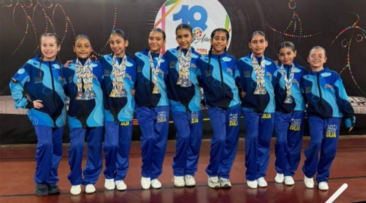 Las representantes del equipo zuliano: Ana Paula Castro, Mía Perozo, Sofía Romero, Victoria Bermúdez, Evaluna Alarcón, Anastasia Arellano, Anyelica Barboza, Kelly Matos y Alessandra González, todas dirigidas por la entrenadora Ibdalys Huerta.