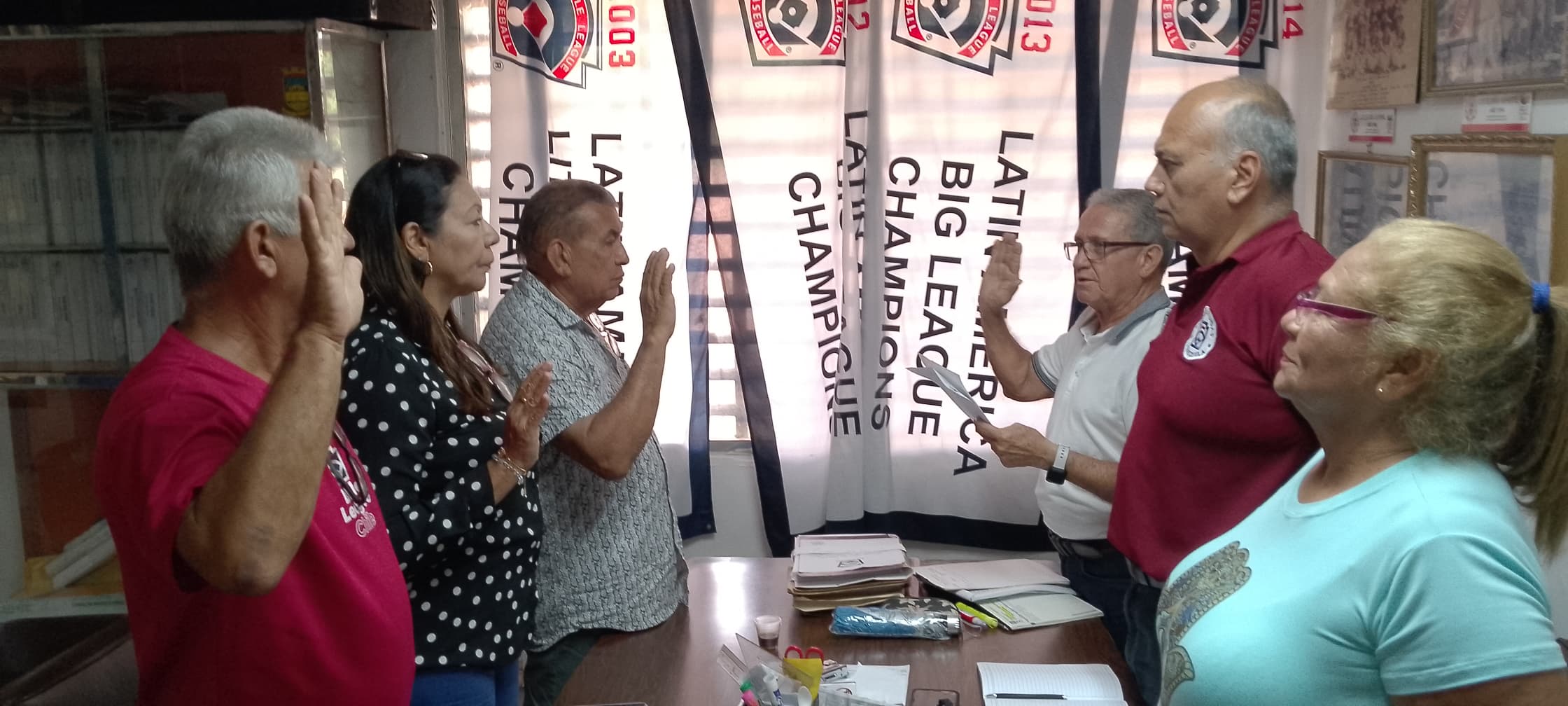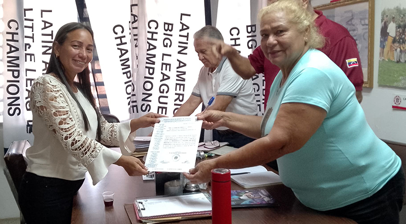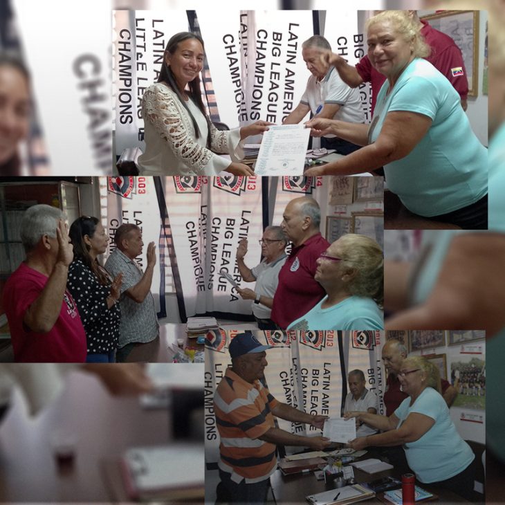 Violeta de Ocando, presidente encargada del Directivo Nacional de Pequeñas Ligas acompañado los directivos Germán Rojas, Idenson Navarro, Morelba Molina, Tania de Rojas, Isandra de Díaz, Doris Rivas, explicó que luego de revisado los procesos electorales en las distintas ligas se revisaron los documentos y se procedió al juramentación entrega de acreditación para el ejercicio de sus funciones.