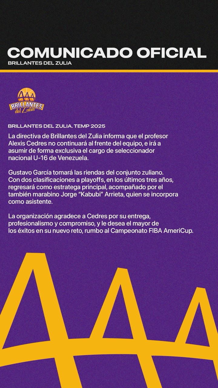 La organización Brillantes del Zulia expresa su profundo agradecimiento a Alexis Cedres por su dedicación, profesionalismo y compromiso durante su gestión, y le desea el mayor de los éxitos en su nuevo desafío al frente de la selección nacional U-16, rumbo al Campeonato FIBA AmeriCup.