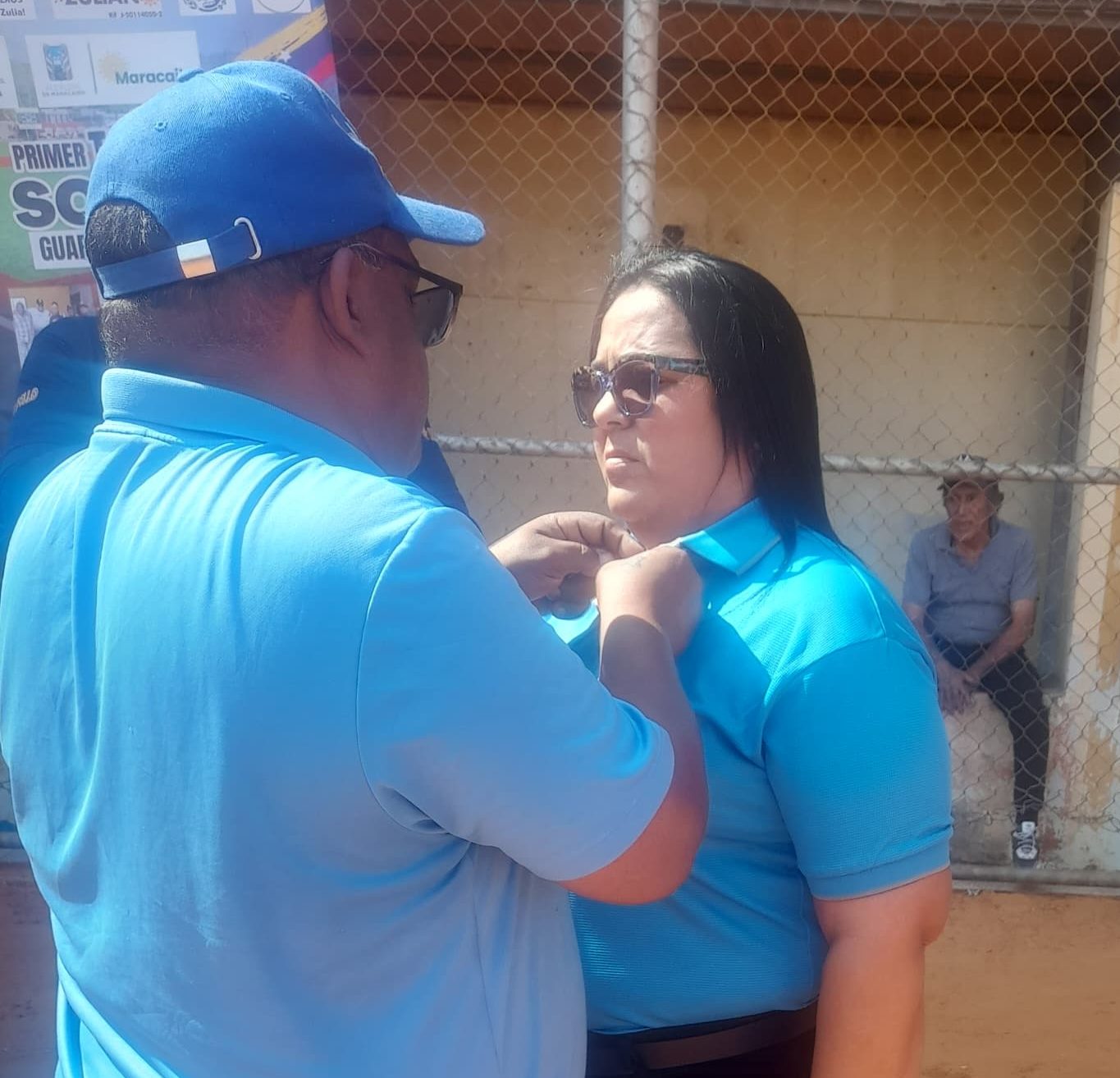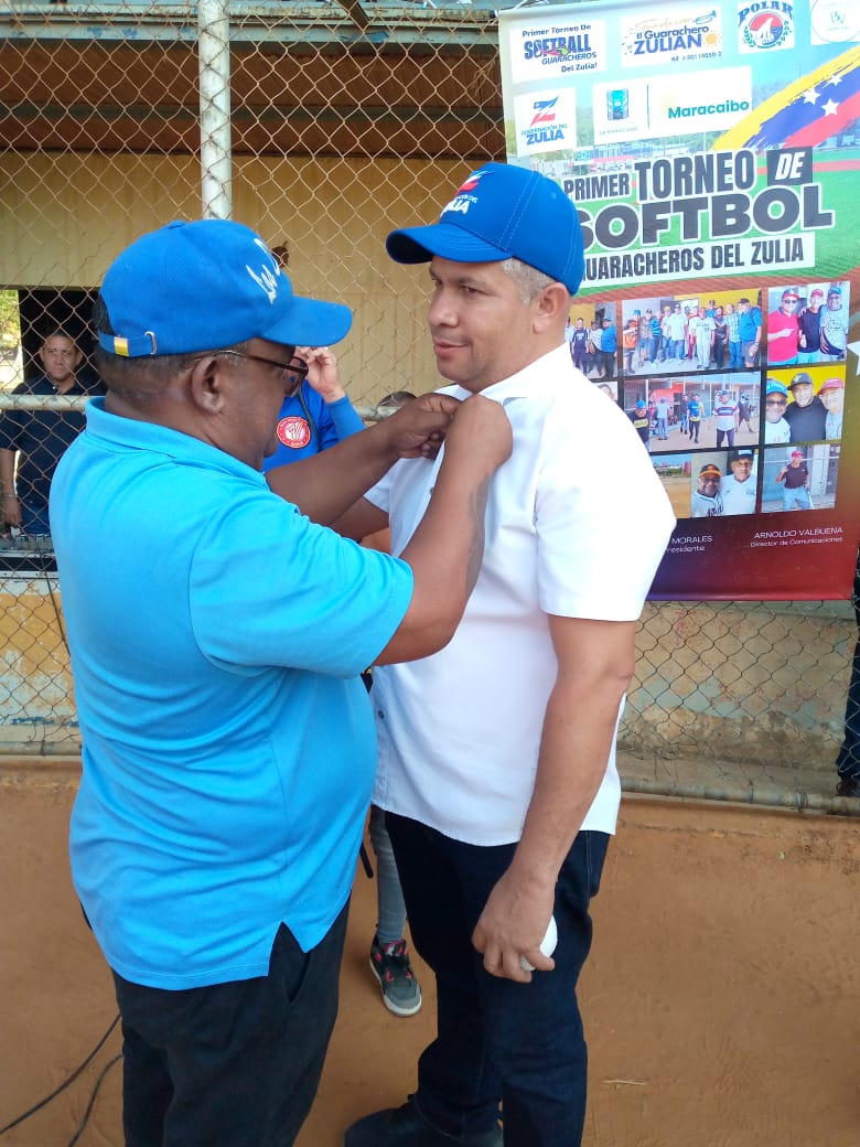 Ely Morales, presidente del Primer Torneo de softbol Guaracheros del Zulia, le hizo entrega a Dany Giraldo de un botón en referencia a la justa guarachera.