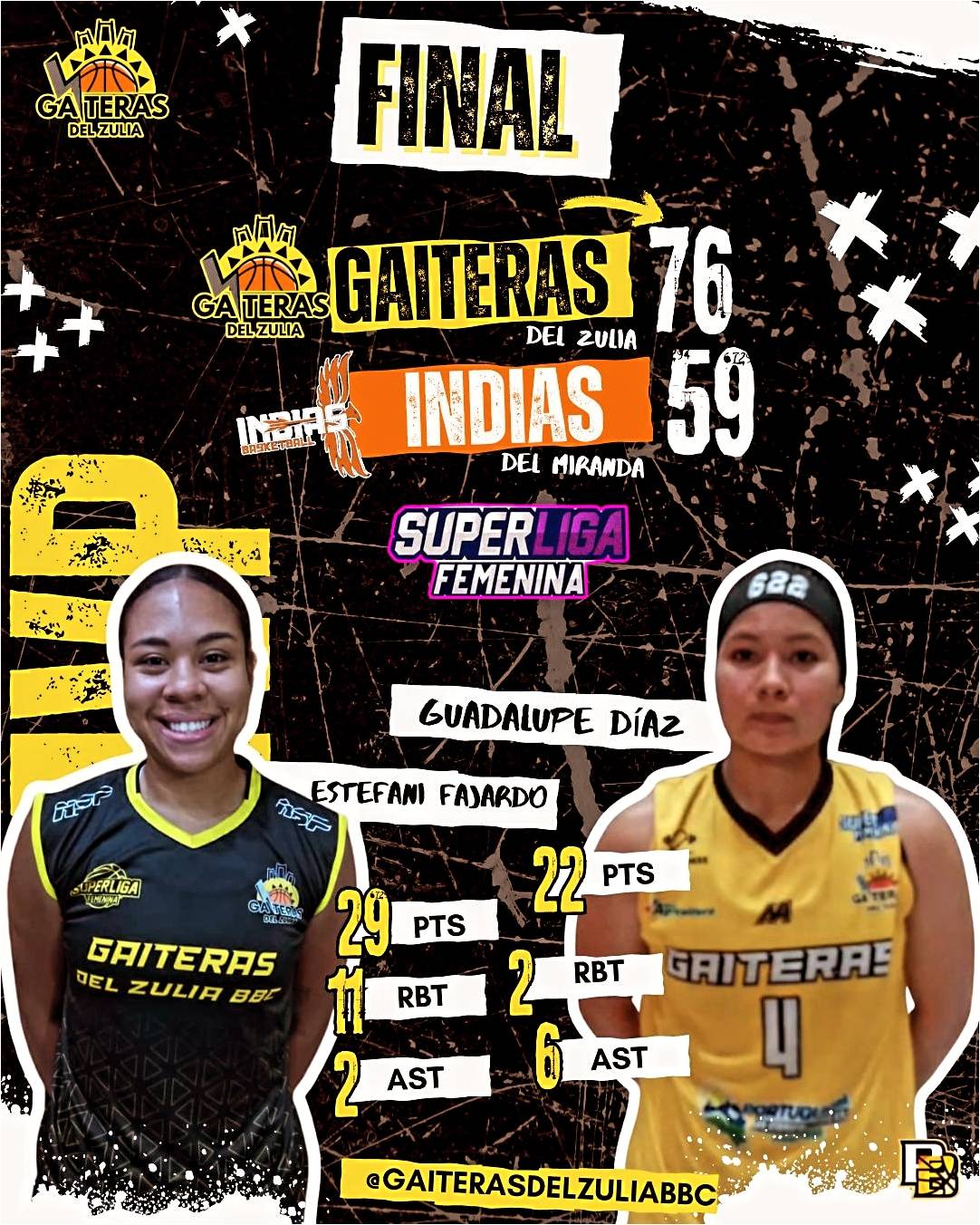 Por el equipo de Gaiteras destacaron, la actuación de la debutante Estefany Fajardo anotando 29 puntos, con 10 rebotes, Guadalupe Díaz con 22 puntos, 2 rebotes y 6 asistencias y Nayara Espinoza con 10 puntos, 9 rebotes y 2 asistencias.