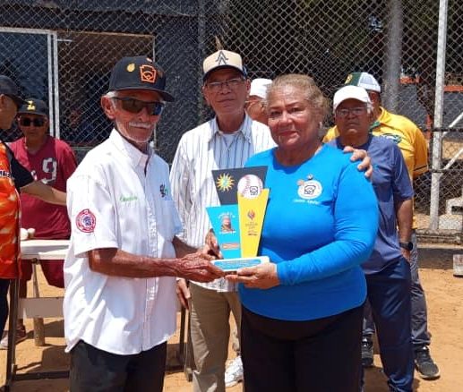 Violeta Aguiar, quien fuera su compañera de vida y hoy lidera con firmeza el Directorio Nacional de las Pequeñas Ligas (DNPLV), recibió el distintivo que honra la multifacética carrera de su esposo.