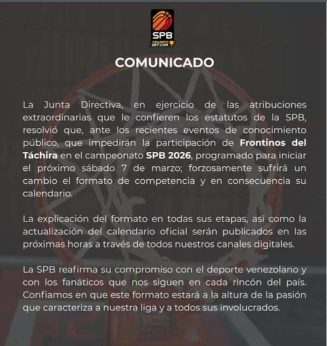 José Gil Deportes Digital/Maracaibo: A tan solo cinco días para el inicio oficial de la temporada 2026, la Superliga Profesional de Baloncesto (SPB) ha emitido un comunicado oficial que altera el panorama de la competición. La franquicia Frontinos del Táchira no participará en la presente edición, lo que ha obligado a la Junta Directiva a modificar el formato de juego y el calendario de manera inmediata.