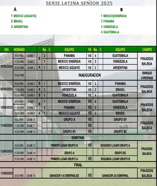 El Latianoamericano Senior se jugara en la Liga Santa María de Aguayo, del 7 al 14 de junio competencia que otorga el cupo a la Serie Mundial que de jugara en Easley California del Sur.