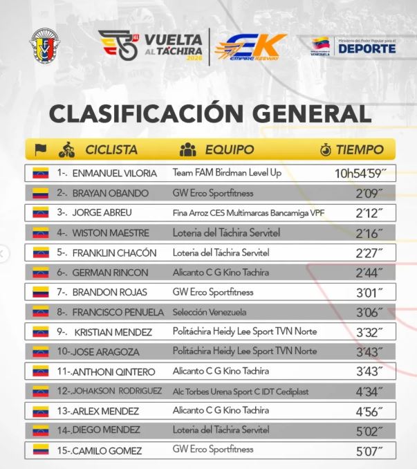 - 3° Jorge Abreu (VEN): Completó el podio para el Fina Arroz CES Multimarcas, reafirmando el dominio local en esta etapa.