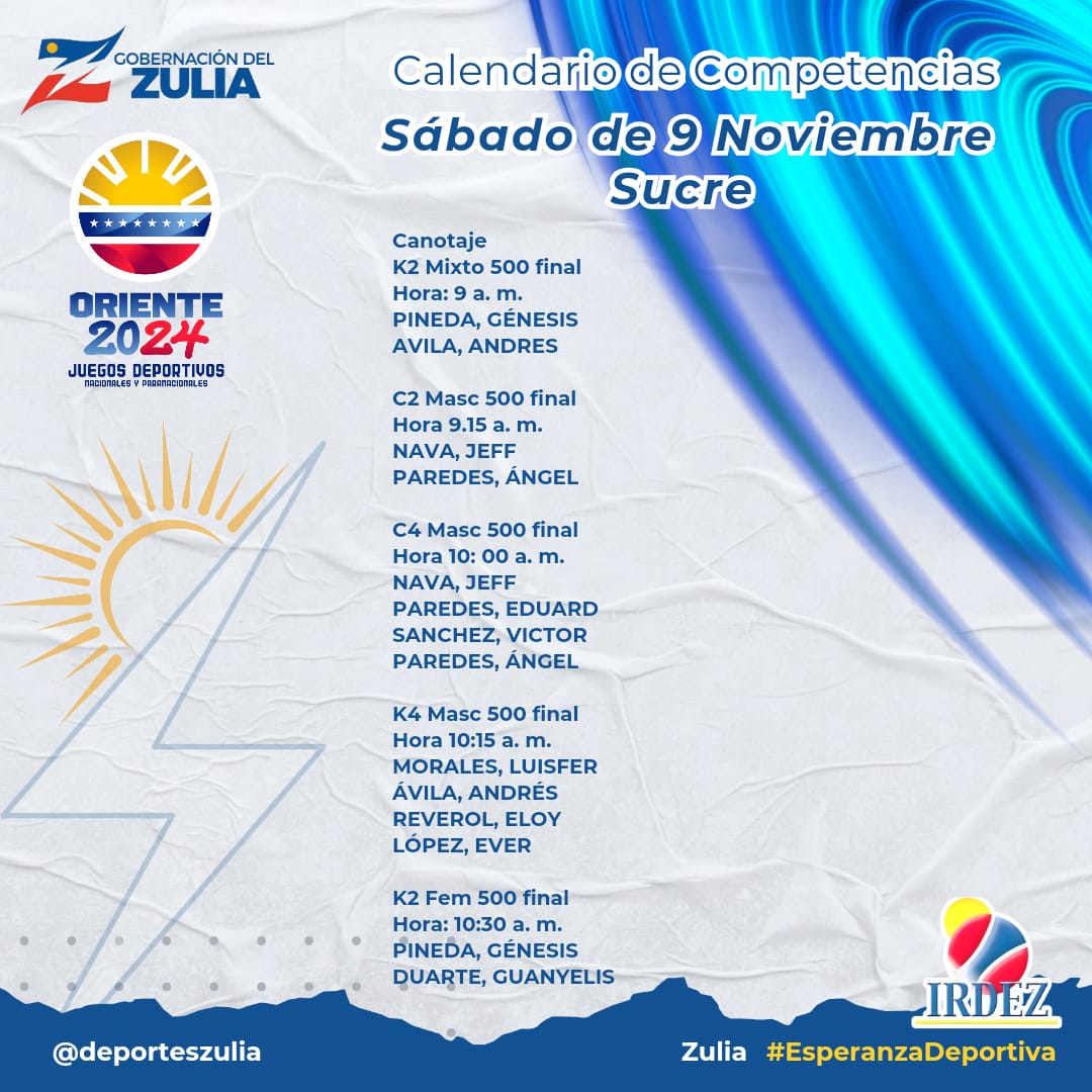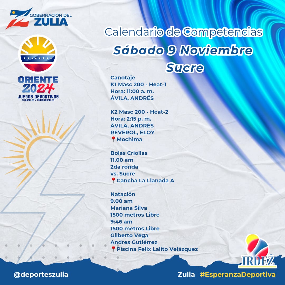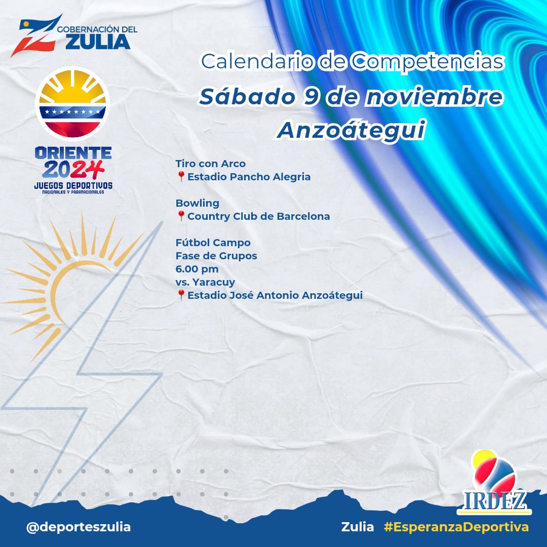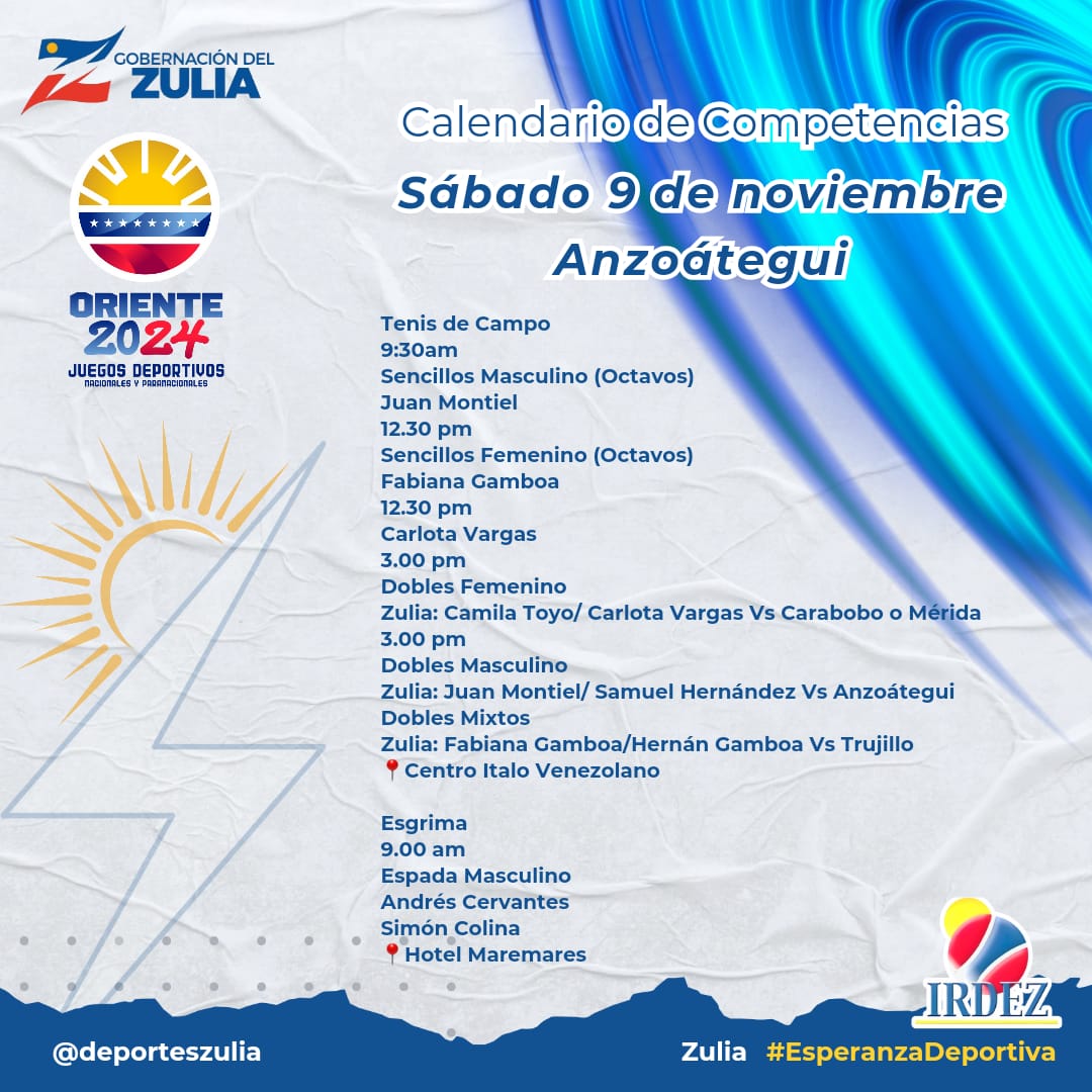 José Gil Deportes Digital Maracaibo: La delegación del Zulia se pone en acción este sábado en el cuarto día de competencia de los Juegos Nacionales en 13 disciplinas, el kikingball disputara medalla de bronce ante Táchira el tenis de campo y canotaje continuaran en su segundo día de competencia el futbol campo, voleibol cancha, esgrima, tiro con arco, natación, boliche,cilismol, judo, estarán en acción.